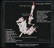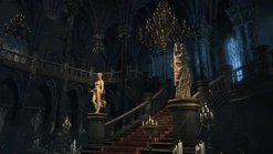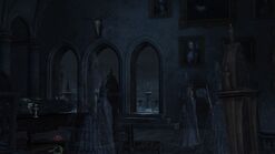 The great, ruined castle is comprised of a large patium filled with ice and dead trees that appears to have catastrophically collapsed under its own weight. A great hall filled with servants that clean the floors and pillars of the luxurious castle; a dining room, with the most luscious silverware decorating the tables can be seen, as well as a large amount of portraits of royalty are exposed on the walls. But the most important part of this decadent construction is the gigantic library that has an unimaginable size, truly colossal and likely an indication of the history and elitist and refined standards of the Vilebloods.