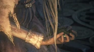 In stark contrast with the Beast Patients, people that slowly turn into monsters under layers of bandages, this woman shows perfectly what happens when a human mutates suddenly into a full-fledged Beast: at first Amelia is seen as a normal human woman with tattered white robes, kneeling and reciting a prayer, but after a few instants she changes abruptly. Her skin ruptures under the force of her new body, splattering blood all around her: now another kind of Cleric Beast, her ash blonde hair has become a long wild mane while her face, covered by scraps of her clothes like the rest of her body, has turned into a lupine head with thin antlers and a slasher smile of sharp teeth.